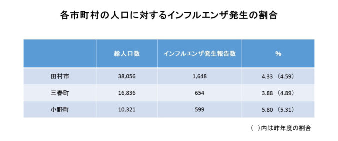 2.三春町は小野町に比べてA型、B型とも発生報告の割合が低かった。