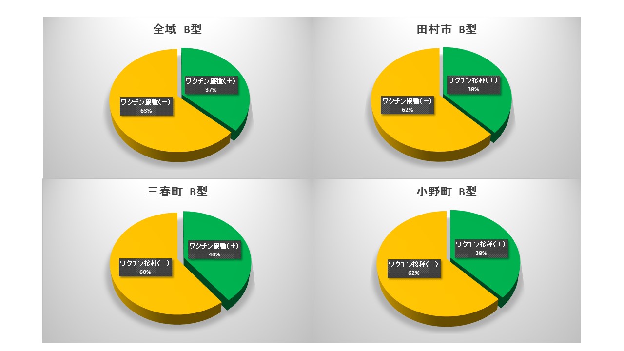 全体的に発生報告数はA型、B型とも小野町に比べ少なかった。ワクチン接種の有無で見ると、接種(-)で発生報告の割合いが高かった。13~15歳群のB型発生の割合はワクチン接種の有無と関係がないように思えた。