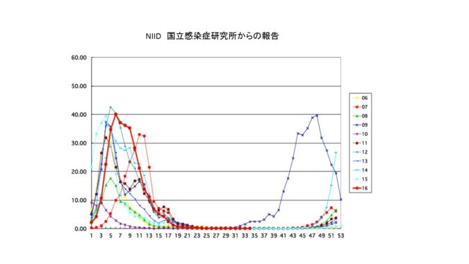 国立感染症研究所からの週別発生報告数のまとめ(第1週から示してある)。赤丸太実線が本年度の流行パターンである。